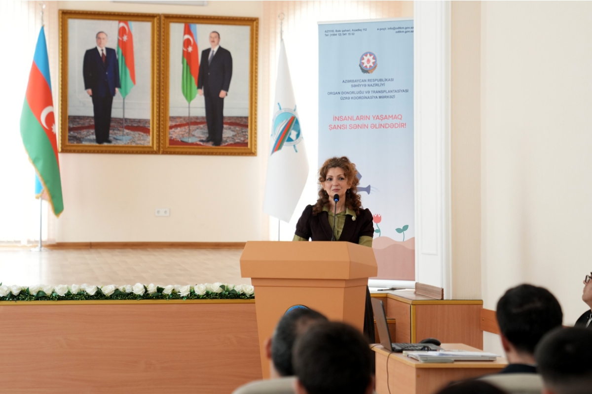 “Orqan Donorluğu və Transplantasiyası üzrə Koordinasiya Mərkəzi” PHŞ-nin İdarə Heyətinin sədri Yeganə Abbasova da çıxışında transplantasiya sahəsinin həm tibbi, həm də sosial əhəmiyyətini iştirakçıların diqqətinə çatdırıb. Mərkəzin həkim-koordinatoru Mehriban Əliyeva isə professor-müəllim heyətini və tələbələri ətraflı məlumatlandırmaq üçün mövzu ilə bağlı təqdimatla çıxış edib.