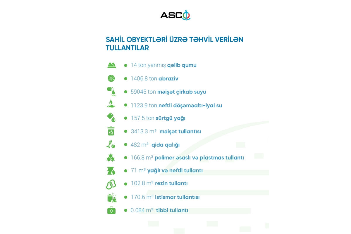 Bu dövrdə ASCO-nun sahil obyektləri üzrə 14 ton yanmış qəlib qumu, 1406.8 ton abraziv (gəmi gövdəsindən çıxan pas-boya-çınqıl-qum qarışığı), 59045 ton məişət çirkab suyu, 1123.9 ton neftli döşəməaltı-lyal su, 157.5 ton sürtgü yağı, 3413.3 m³ məişət tullantısı (kağız-karton, taxta, əski, şüşə, metal, butulka və s.), 482 m³ qida qalığı, 166.8 m³ polimer əsaslı və plastmas tullantı, 71 m³ yağlı və neftli tullantı, 102.8 m³ rezin tullantı, 170.6 m³ istismar tullantısı, 0.084 m³ tibbi tullantı aidiyyəti üzrə təhvil verilib.