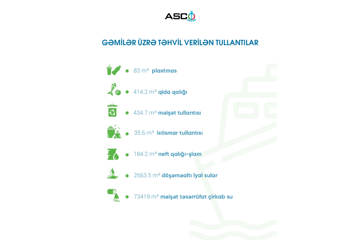 Hesabata əsasən, 2025-ci ilin yanvar-sentyabr ayları ərzində ASCO gəmilərindən 83 m³ plastmas, 414.2 m³ qida qalığı, 434.7 m³ məişət tullantısı (kağız-karton, əski, şüşə, metal və s.), 35.6 m³ istismar tullantısı, 184.2 m³ neft qalığı-şlam, 2663.5 m³ döşəməaltı lyal su, 73419 m³ məişət təsərrüfat çirkab su təhvil verilməklə ərazidən kənarlaşdırılıb.