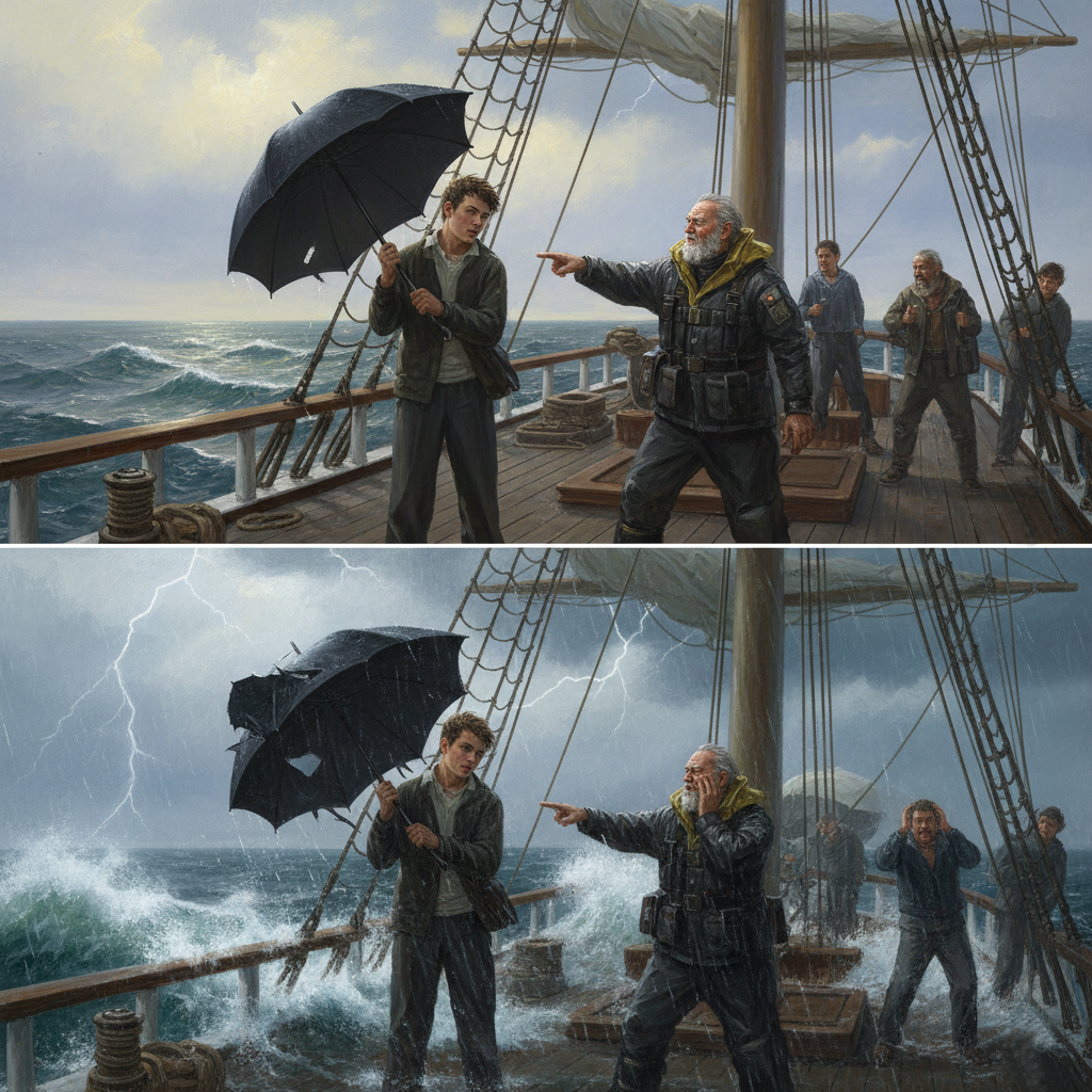 Göyərtədə çətir açmaq: Bu, dənizçilər üçün ən mənasız, lakin ən qorxulu hərəkətlərdən biri idi. Axı, dənizin ortasında çətirə nə ehtiyac var? Onlar inanırdılar ki, çətir açmaq dənizə "həddindən artıq yağış və fırtına istəyirəm" mesajını verməkdir.
