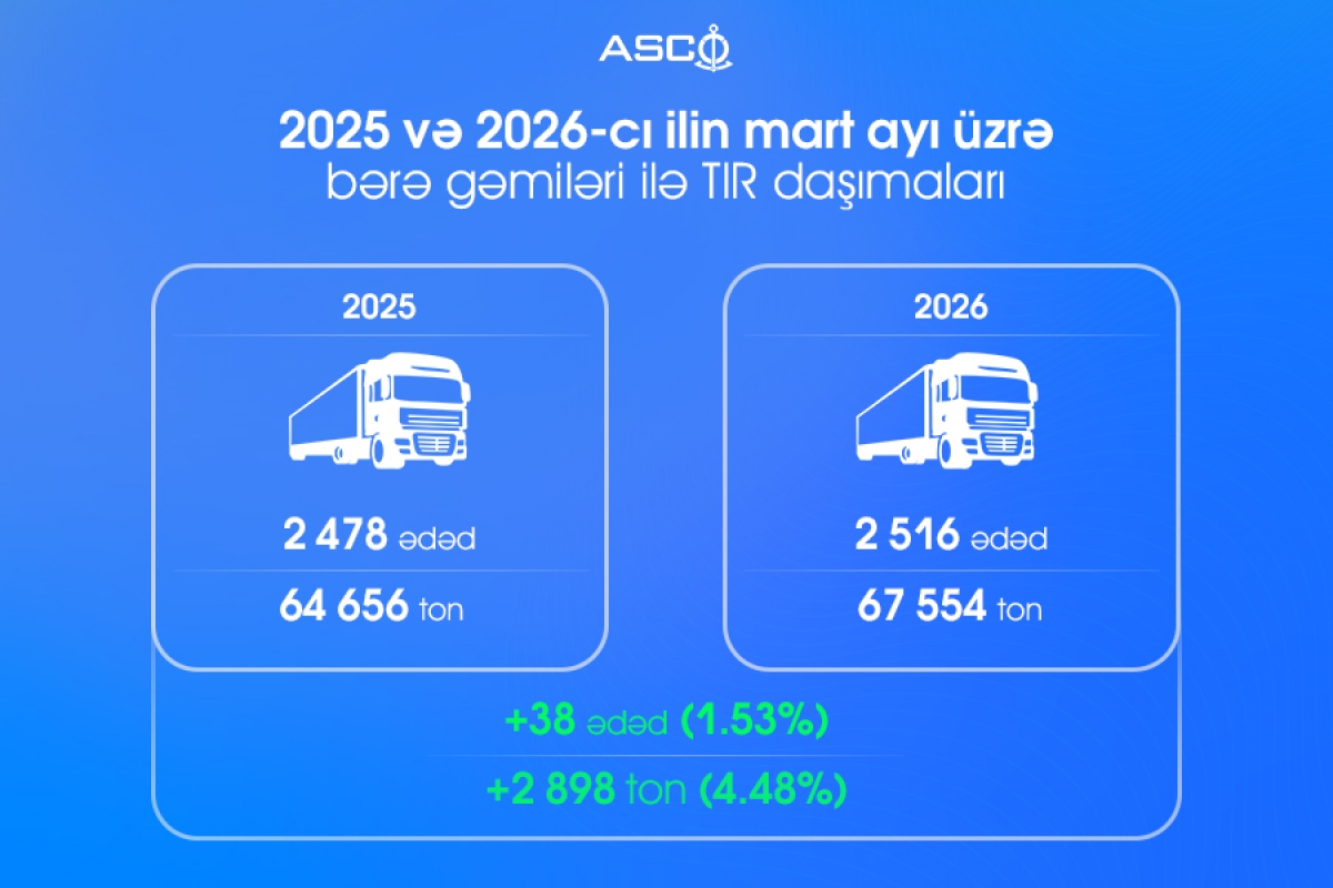Belə ki, 2025-ci ilin mart ayında bərə gəmiləri ilə 2 811 ədəd vaqon daşındığı halda, 2026-cı ilin eyni ayında bu göstərici 3 438 ədədə yüksəlib. Artım 627 ədəd və ya 22,3 faiz təşkil edib.