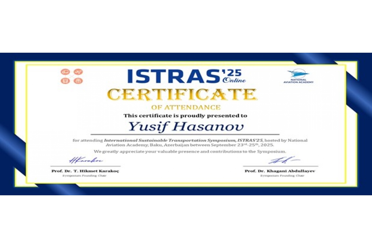 Aviasiya Akademiyasında təşkil olunmuş beynəlxalq simpoziumda Y.N. Həsənov, B.B. Əhmədov və Ş.T. Yusubovun təqdim etdiyi üç müxtəlif elmi məruzə təşkilat komitəsi tərəfindən yüksək qiymətləndirilib, sertifikatlara layiq görülüb və Almaniyanın “Springer” nəşriyyatına məxsus elmi jurnalda dərc olunmaq üçün təqdim edilib.