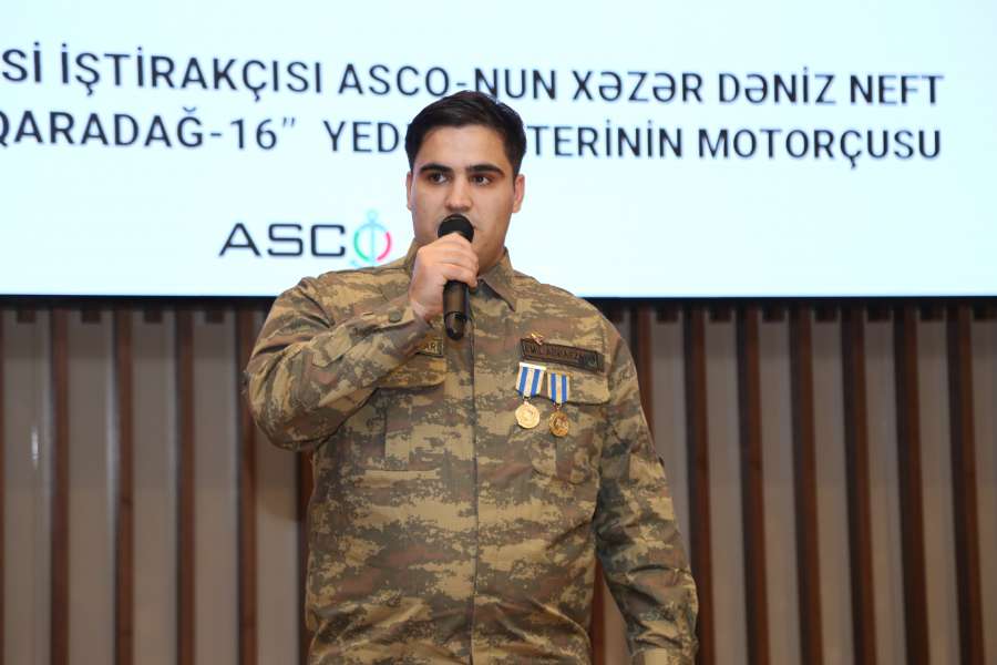 Daha sonra çıxış üçün söz Azərbaycanın ərazi bütövlüyünün təmin edilməsi uğrunda döyüş əməliyyatları zamanı vəzifə borcunu şərəflə yerinə yetirərkən şəhidlik zirvəsinə ucalan, Prezidenti İlham Əliyevin müvafiq sərəncamları ilə "Vətən uğrunda" və "Xocavəndin azad olunmasına görə" medalları ilə təltif edilən Azərbaycan Ordusunun kapitanı Pərviz Məmmədovun atasına – ASCO-nun Bibiheybət” Gəmi Təmiri və Tikintisi Zavodunun gəmi boruçəkəni Ələddin Məmmədova verilib. O, çıxışında övladının Vətən uğrunda şəhid olmasından qürur hissi keçirdiyini bildirib.