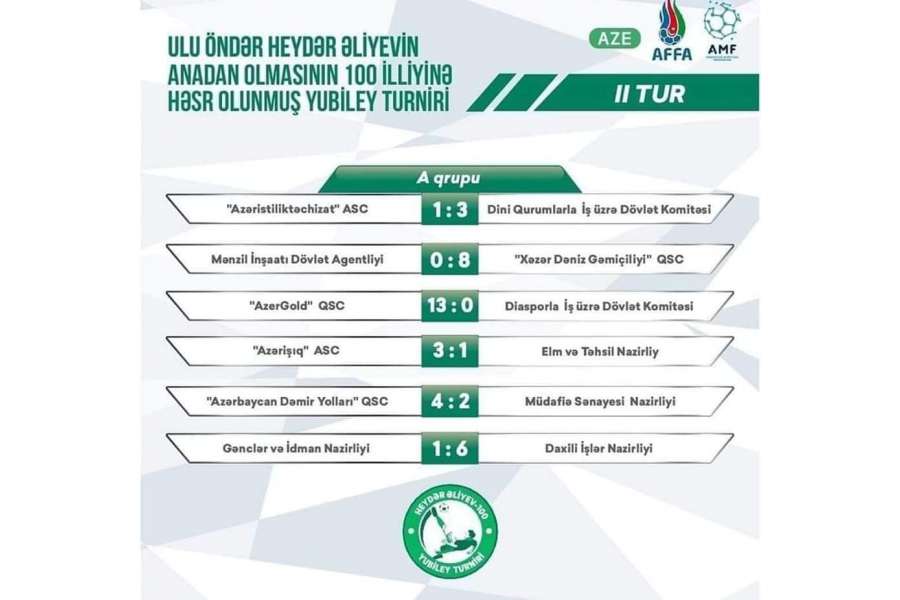 52 dövlət qurumunun iştirakı ilə Ulu Öndər Heydər Əliyevin 100 illik yubileyinə həsr olunmuş futbol turniri davam edir.