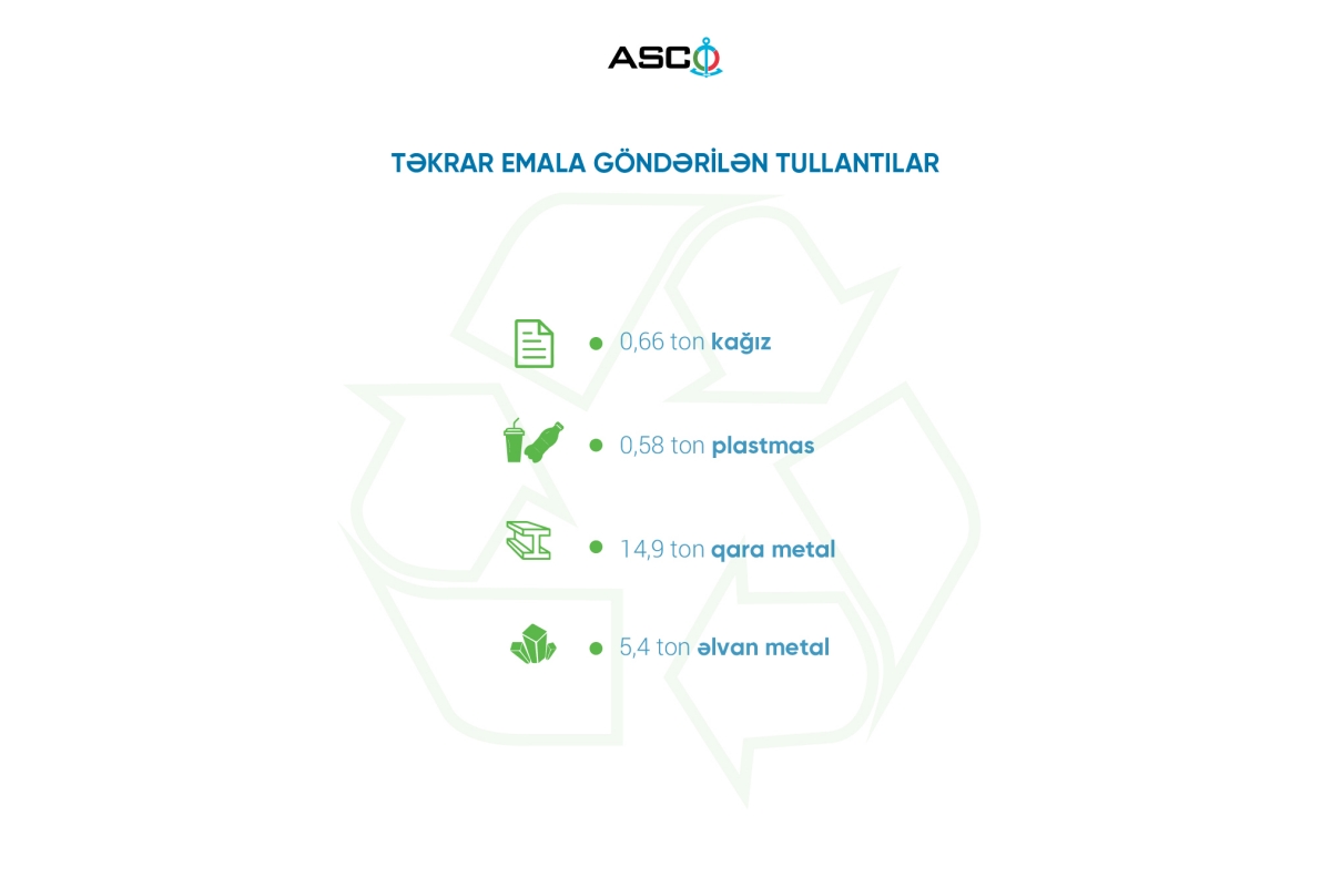 Qeyd edilən dövrdə 0.66 ton kağız, 0.58 ton plastmas, 14.9 ton qara metal, 5.4 ton əlvan metal təkrar emala göndərilib.